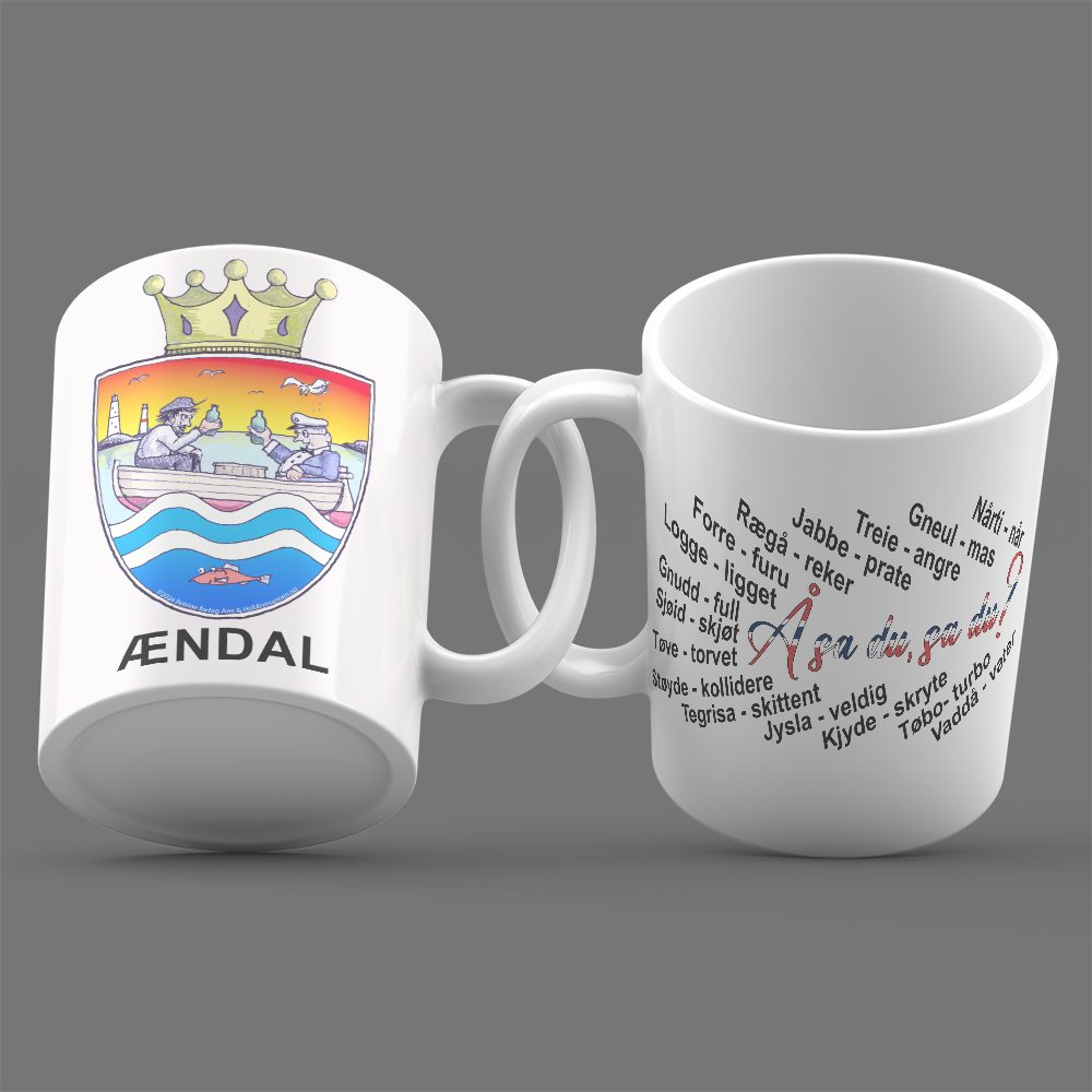 Ændalskoppen er det perfekte kruset for deg som ønsker å starte dagen med et smil. Dette keramiske kruset er designet har motiv av den talentfulle tegneren Øystein Bjørløw og har et helt spesielt motiv – det nye humoristiske “byvåpen skjoldet” for Arendal.