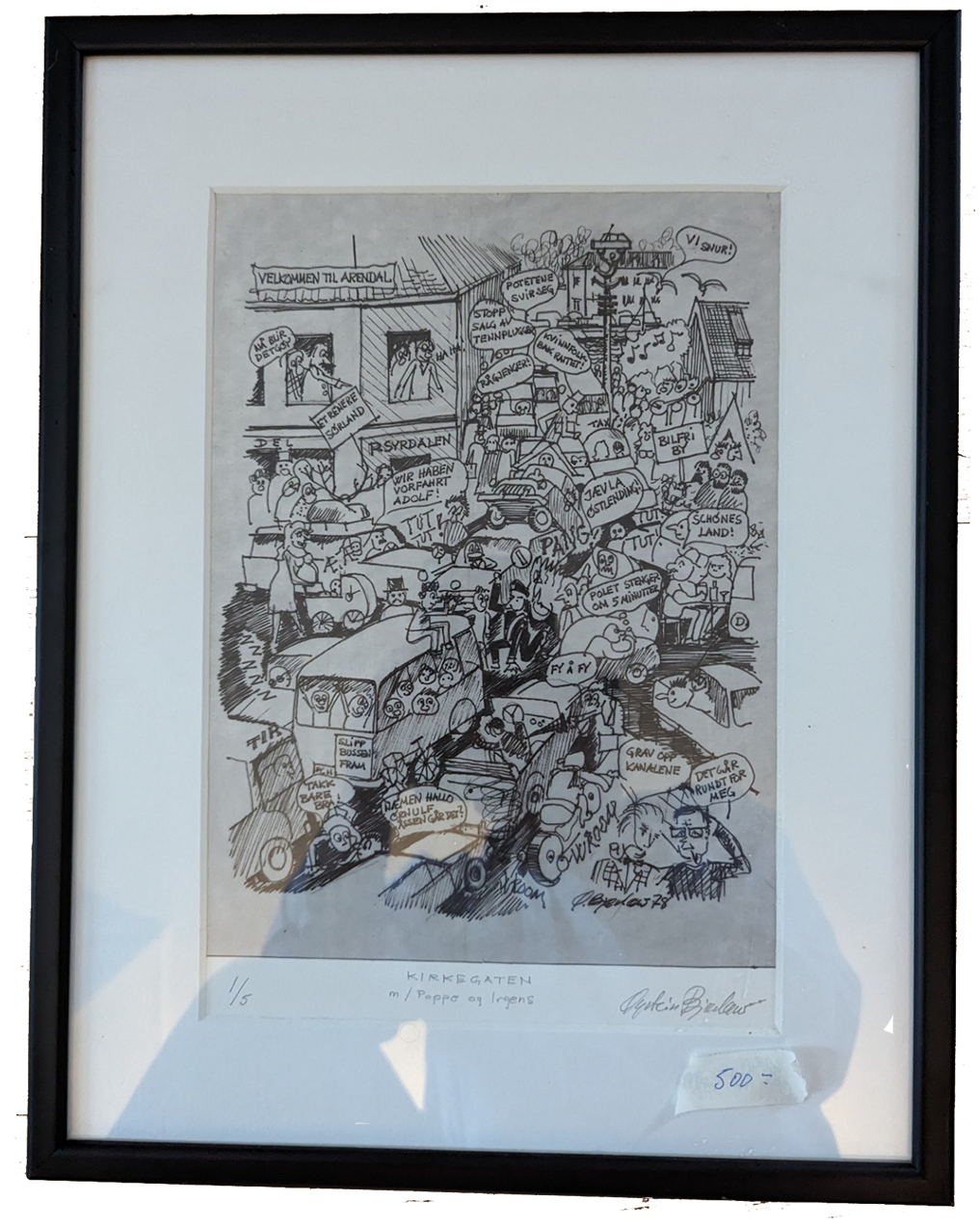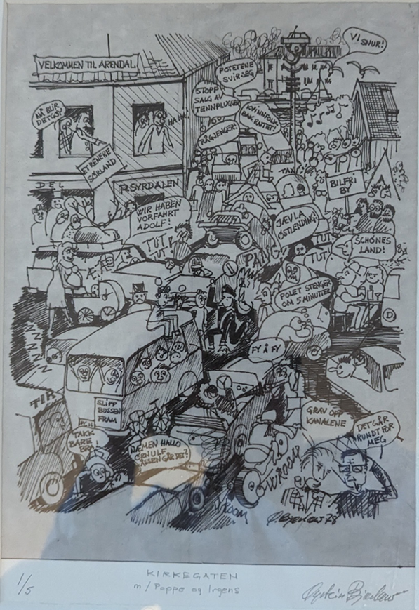 Øystein Bjørløw fremstilling av kaoset som kunne være i Kirkegaten i Arendal på 70-tallet, bildet er fra 1978.