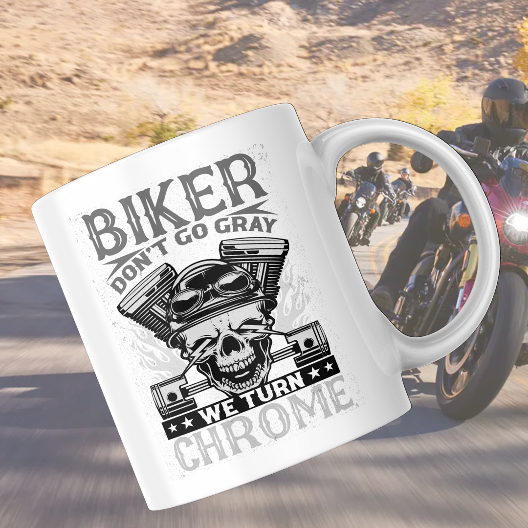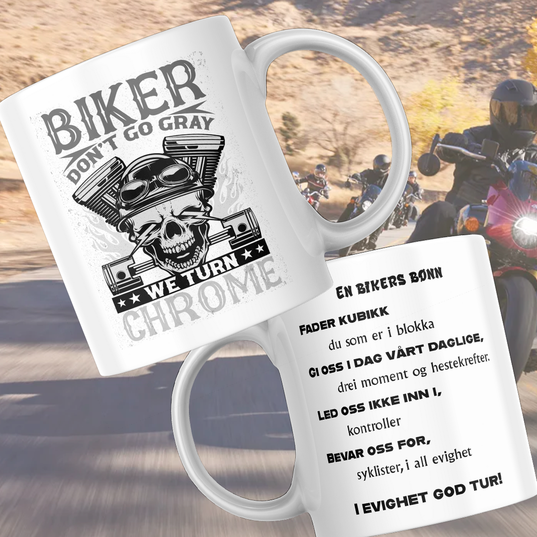 Ett krus til motorsyklisten, med motorsyklisten bønn på den andre siden.