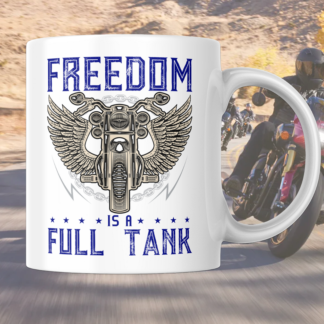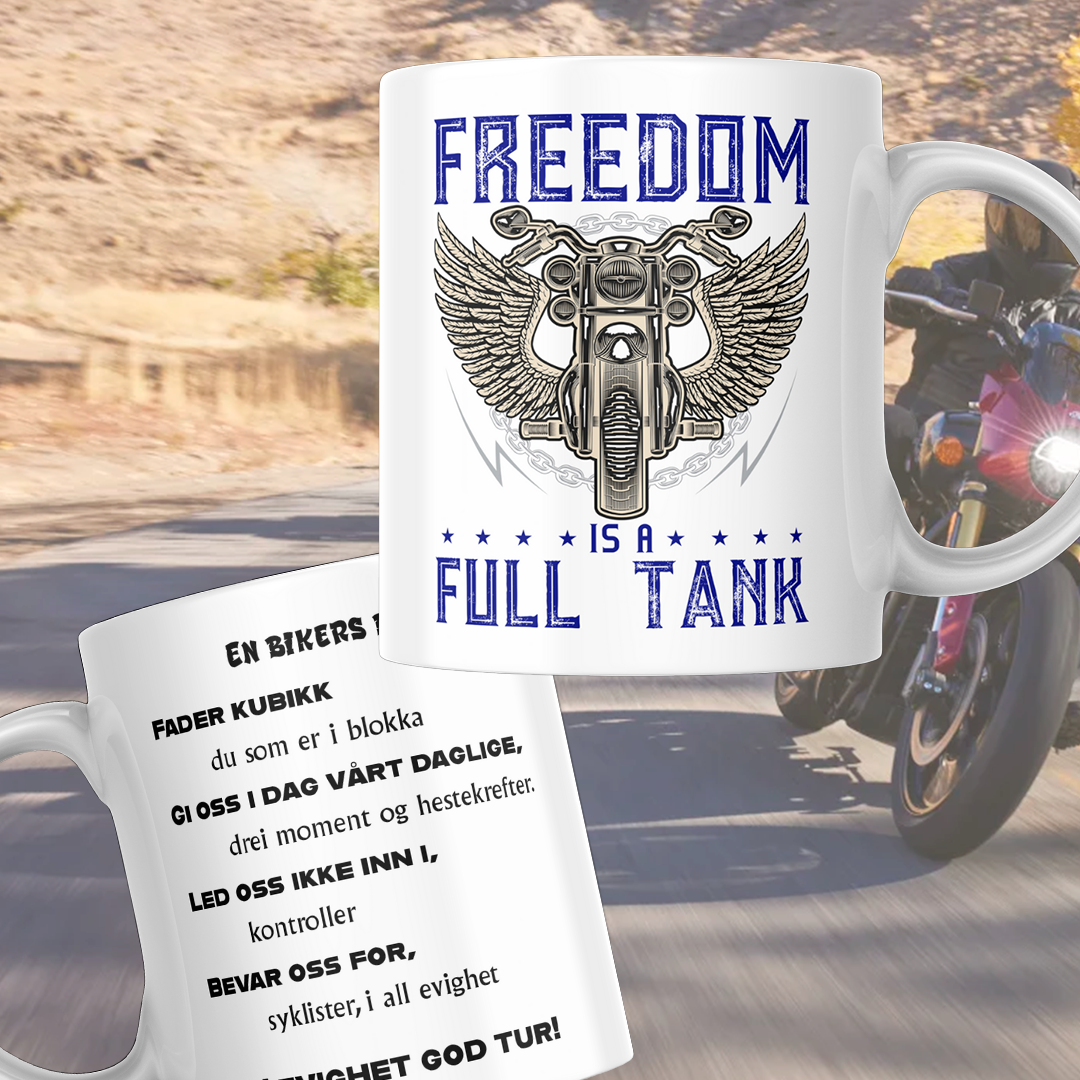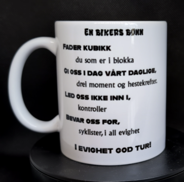 Ett krus til motorsyklisten, med motorsyklisten bønn på den andre siden.