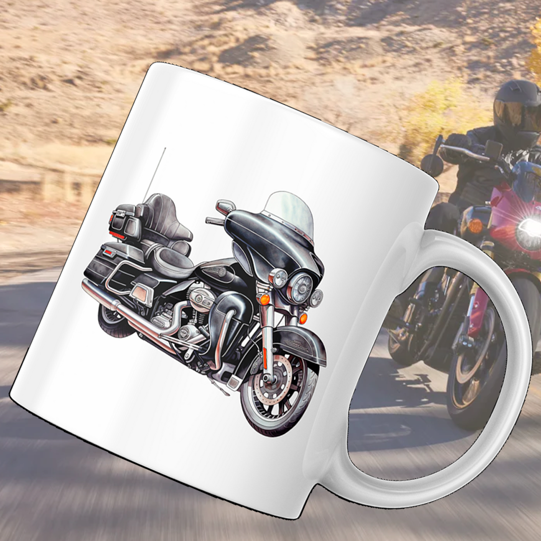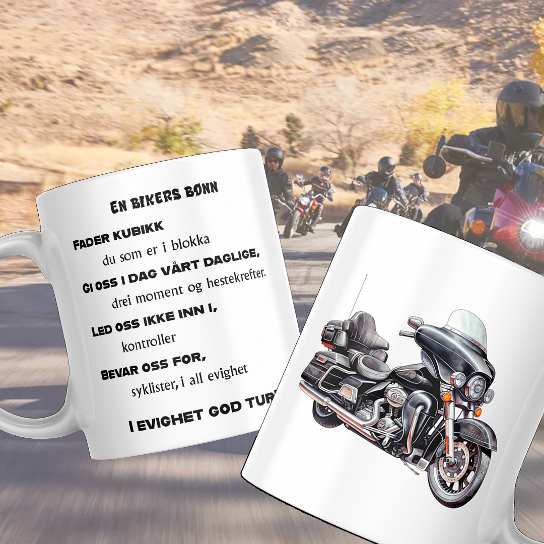 Ett krus for motorsyklisten og dets bønn. Garantert å skape ett smil om munnen.