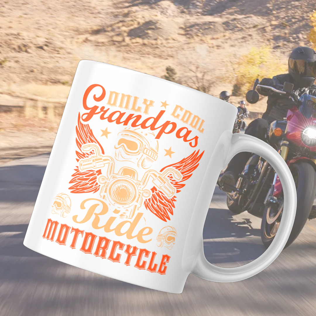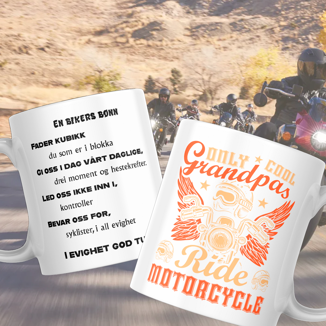 Ett krus for motorsyklisten og dets bønn. Garantert å skape ett smil om munnen.
