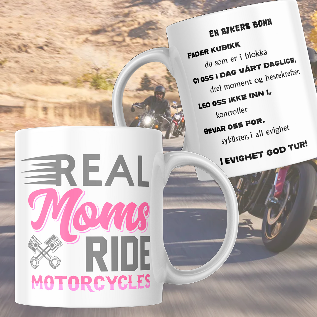 Ett krus til motorsyklisten, med motorsyklisten bønn på den andre siden.