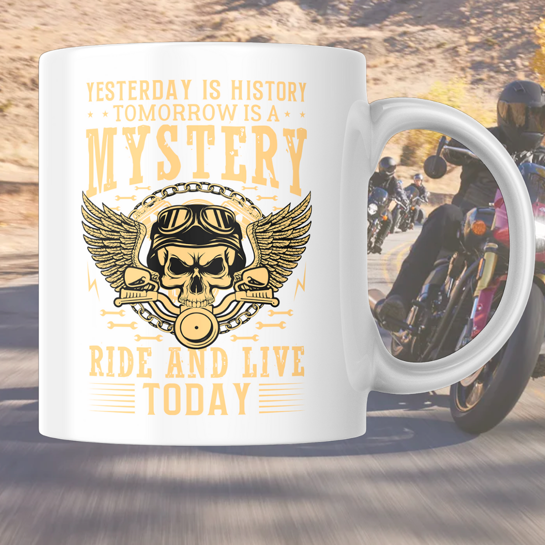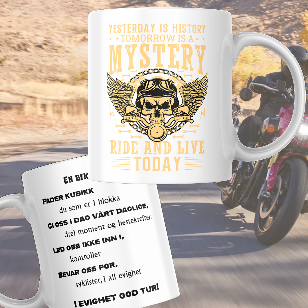 Ett krus til motorsyklisten, med motorsyklisten bønn på den andre siden.