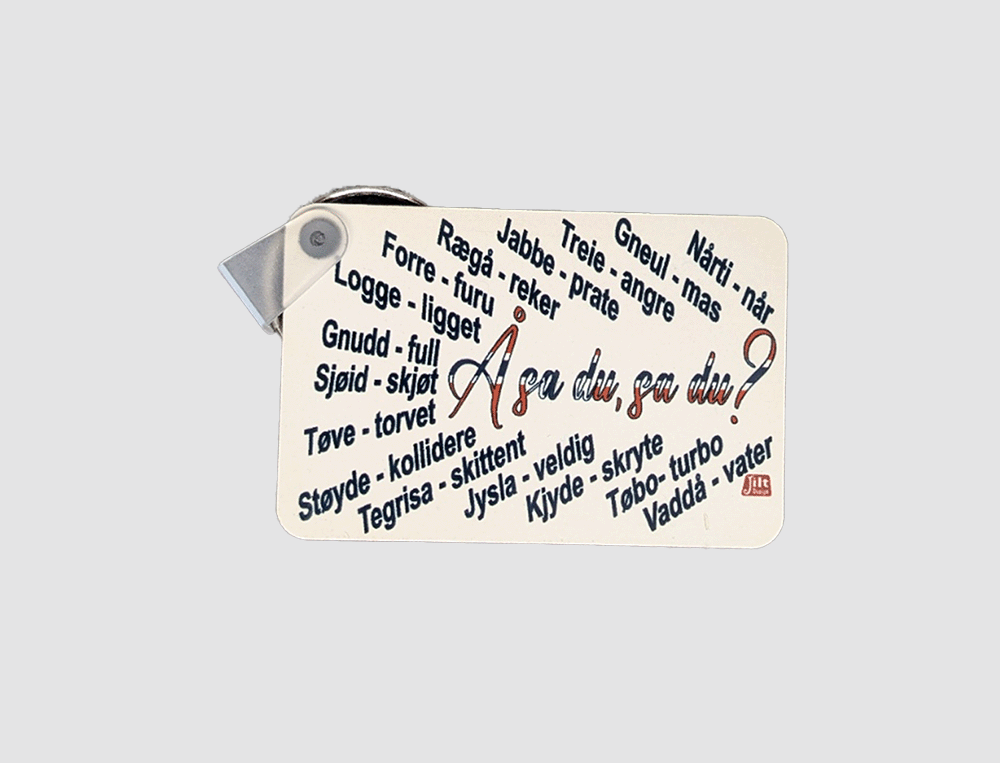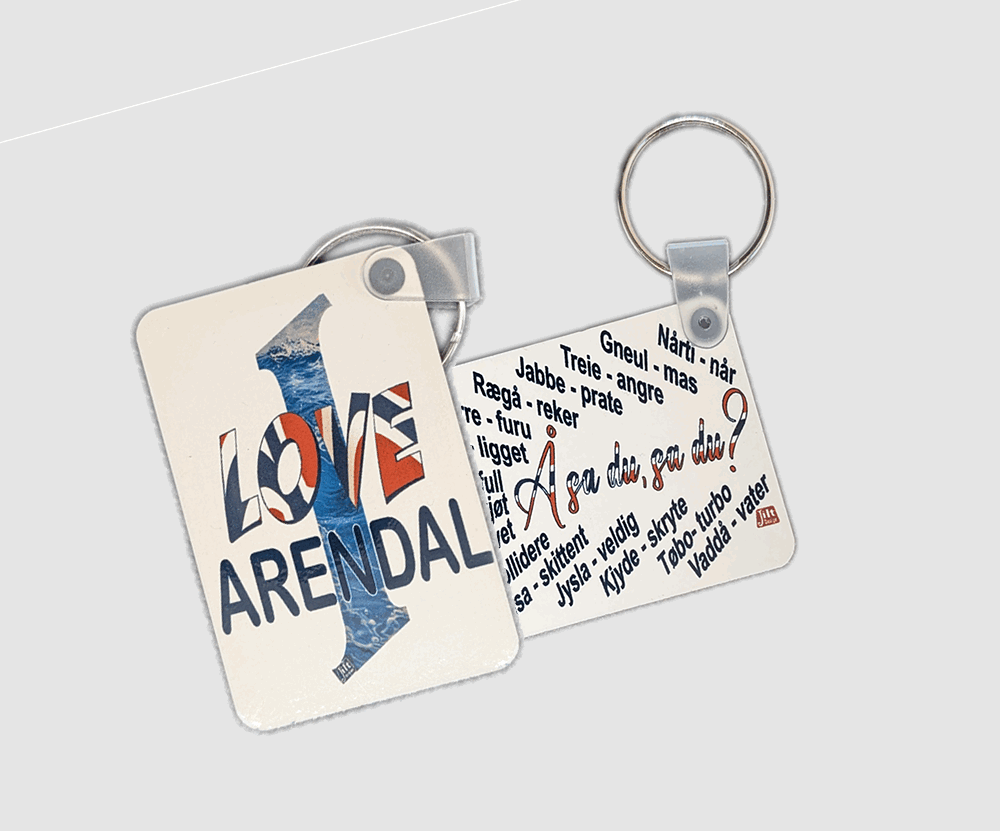 I våre serie «I love Arendal» har vi nå laget i nøkkelring med bilde på fremsiden og «Å sa du, sa du?» på baksiden som er en «ordbok for lokale ord som oversettes til bokmål».